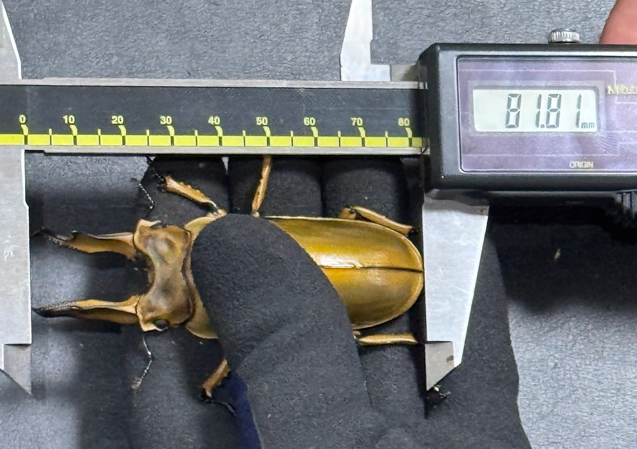 RYM様 ババ80UP 3頭 2025年10月20日 RYM様から画像をいただきました、おめでとう御座います。 菌糸はどの個体もプリカ→800→1400→1400になります。 この個体は最終体重23.8gになります。 81.8mm 最終体重28.1g «前 次» 店長日記